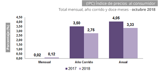 En octubre de 2018, el IPC registró una variación de 3,33 en comparación con octubre de 2017. Cuatro grupos se ubicaron por encima del promedio nacional: Educación (6,37%), Salud (4,64%), Transporte (4,39%) y Vivienda (4,08%). El resto de los grupos de gastos se ubicaron por debajo del promedio: Otros gastos (2,27%), Alimentos (2,25%), Diversión (1,82%), Comunicaciones (1,62%) y Vestuario (0,26%).